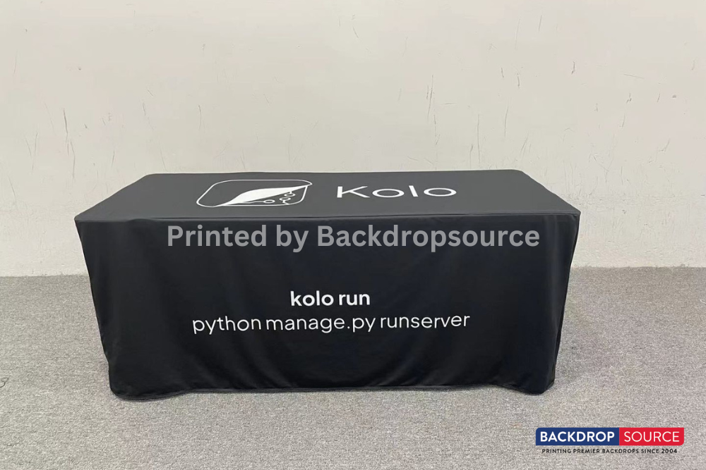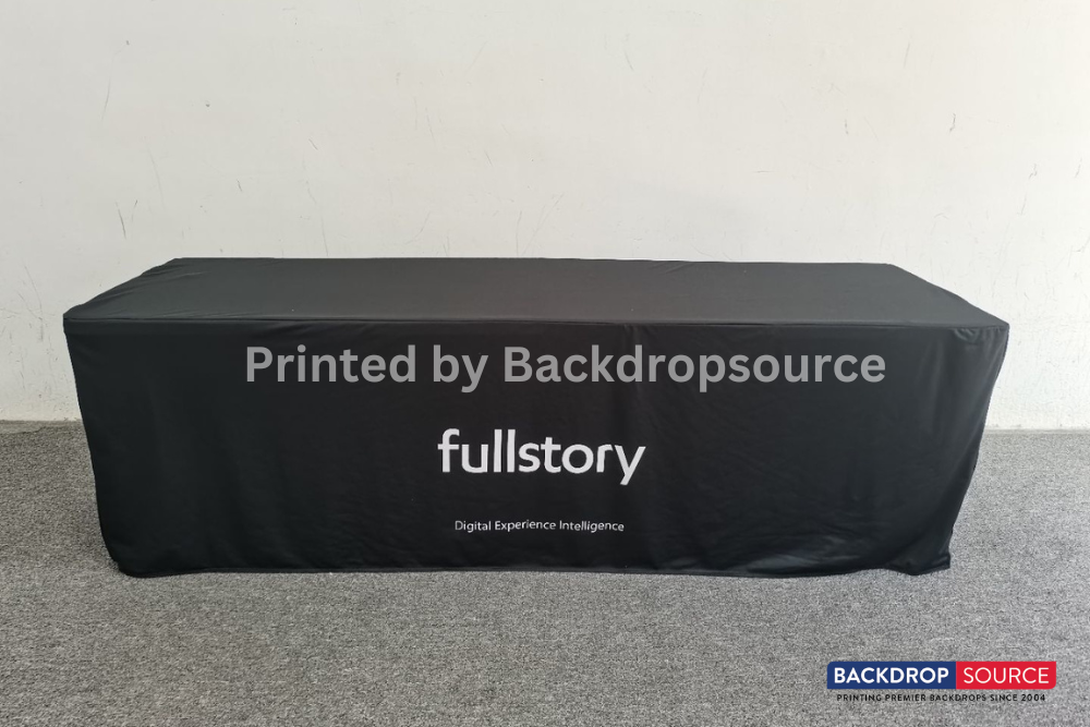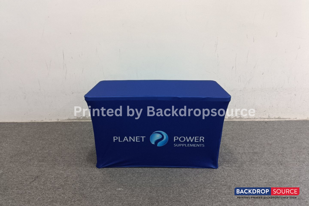 Tablecloths are an essential part of any trade show. Printing your logo or slogan or any other message on your tablecloth automatically completes your brand image and says a lot about your company's image. At Backdropsource Printing, we offer 3-sided and 4-sided table covers, which are great not only for your branding, but you can actually hide all the boxes under your table. Our tablecloths are sublimated and 100% washable. It is made up of 8.8 ounces. polyester table cloth with rounded corners that hang approximately 2" above the floor.It's stretchable up to 20%.