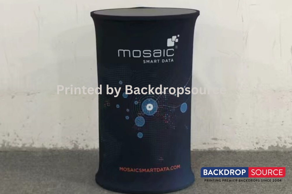 La surface du comptoir est fabriquée en MDF et est reliée à la base par trois solides poteaux en aluminium, tandis que la chaussette en tissu tendu se glisse simplement sur le cadre pour assurer une bonne tenue. Le tissu est fabriqué à l'aide de la dernière technologie d'impression par sublimation et offre un affichage sans faille une fois appliqué sur le cadre.